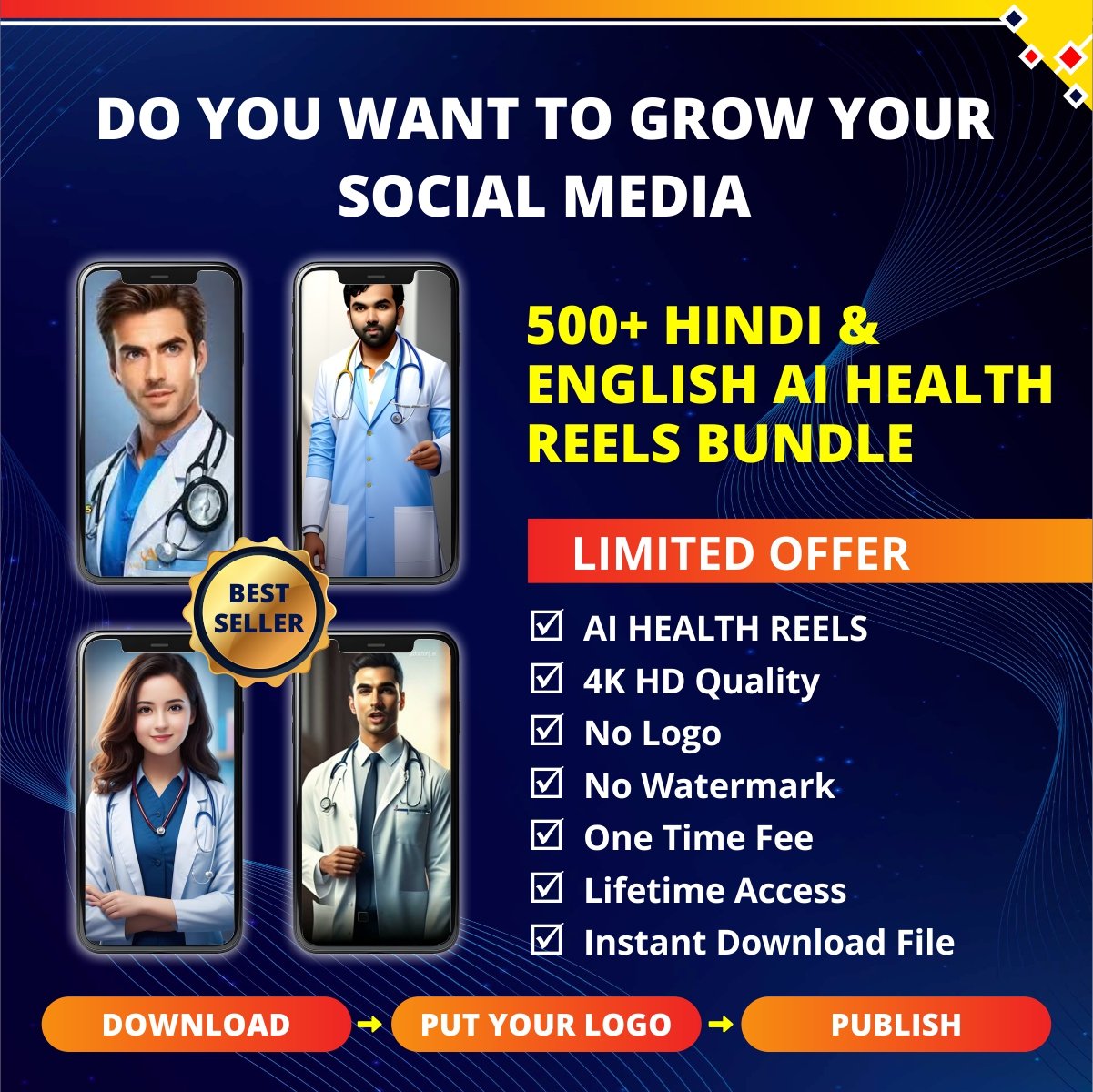 Are you looking to boost your social media presence? Get the Ai Hindi & English Health Reels Bundle. Simply download, add your logo, and publish.
